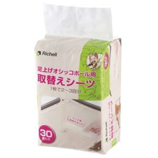 トイレ内に的づくり!オシッコを吸収して、はみ出し軽減。 ・リッチェル 足上げオシッコポール用の取替えシーツです。 ・本体のレリーフを通してオシッコがシーツに吸収されます。超小型犬、小型犬のオシッコ2〜3回分に対応します。シーツ吸水量:約75cc (容量:30枚入り) ■材質/素材不織布:ポリプロピレン 吸水紙:パルプ 吸収体:ポリアクリル酸系吸水性樹脂 接着剤:ホットメルト接着剤 ■原産国または製造地 中国 ■商品使用時サイズ17.3×23Hcm