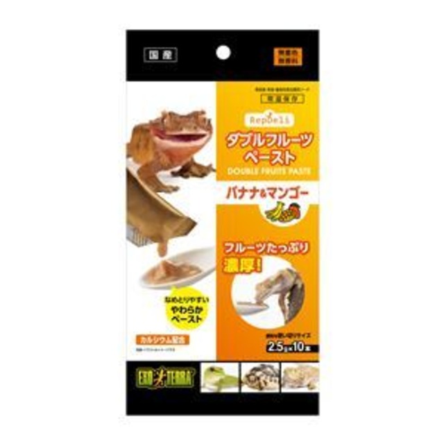 ・栄養豊富で嗜好性の高いバナナとマンゴーの果実をそのまま潰したリッチなペーストです。 ・開封してそのまま与えられるペーストタイプ ・果実食のヤモリ類はもちろん、フトアゴヒゲトカゲやリクガメなど、草食・雑食性の爬虫類の副食としてお使いいただけます。 ■原材料(成分): マンゴー、バナナ、炭酸カルシウム、増粘多糖類 ■保証成分: たんぱく質0.4%以上、脂質0.1%以上、粗繊維0.1%以下、灰分3.0%以下、水分89.0%以下、カルシウム1.0%以上 ■賞味/使用期限(未開封): 720日 ■原産国または製造地:日本 ■使用方法: ・スプーンや餌皿に絞り出して与えてください。 ※パウチのまま与えると、開封口でのケガや、パウチを誤飲する可能性があります。 ・エサは日中の温度の高い時間に与え、与えた後数時間は、消化不良を防ぐためケージ内の温度は下げないようにしてください。 ・新鮮な水をいつでも飲めるようにしてください。 ■保管方法: ・お買い上げ後は高温多湿、直射日光を避け、常温で保存してください。 商品パッケージは予告なく変更される場合があり、登録画像と異なることがございます。