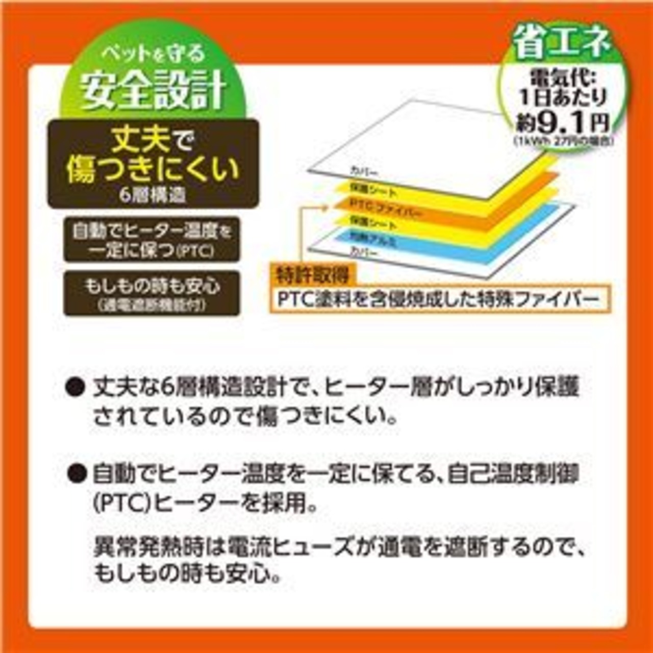 ・ペットを守る安全設計。丈夫な6層構造設計で、ヒーター層がしっかり保護されているので傷つきにくい